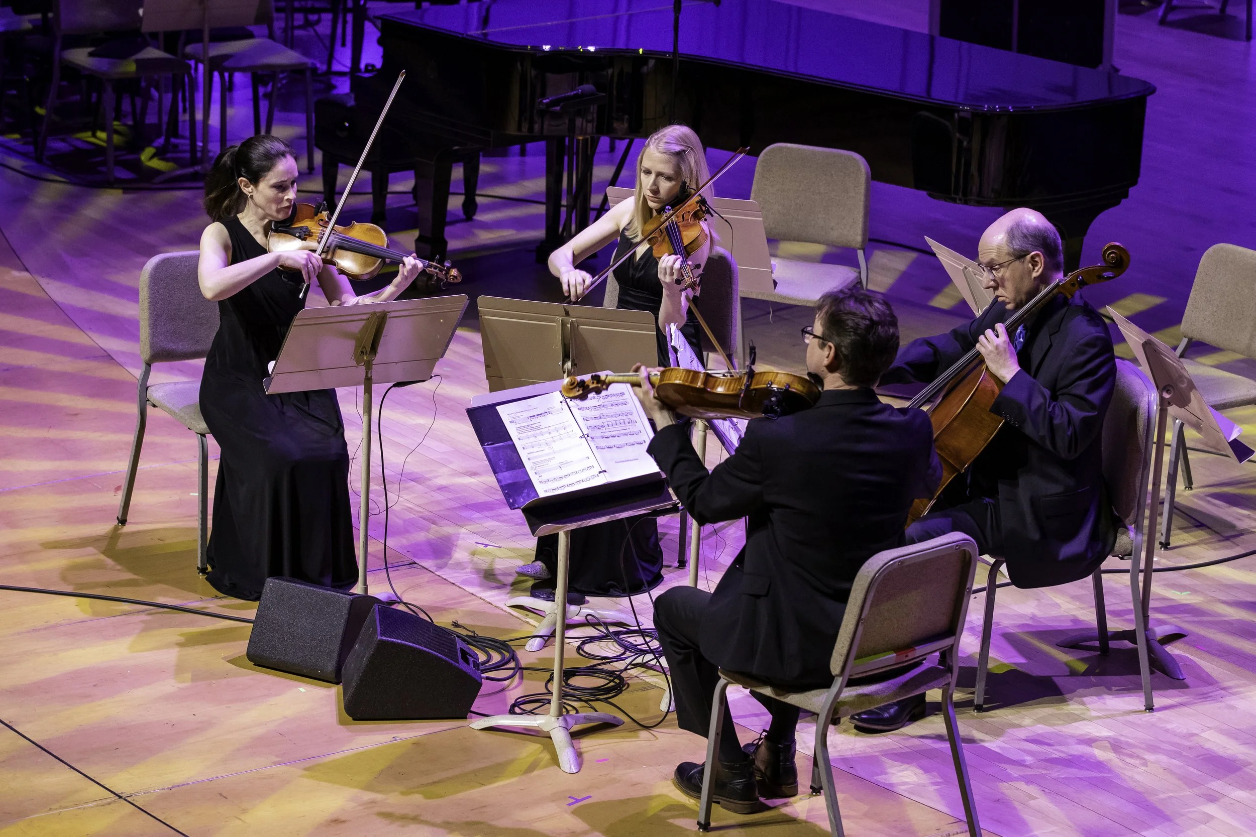 The Tatar-Russian composer Sofia Gubaidulina’s single-movement Quartet Number 4, played exquisitely by the Lydians, places the musicians on stage along with two prerecorded quartets in which the first (A) is a quarter tone higher than the second (B). The work, commissioned by the Kronos Quartet and premiered nearly 25 years ago in January, 1994, still sounds and feels fresh and experimental, yet includes many classical elements, ranging from medieval polyphony to contemporary work. Gubaidulina asks “how the ‘real’ arises from the ‘unreal’… creatively speaking.” . . . Is this a quartet? Or is some other title more appropriate here?”